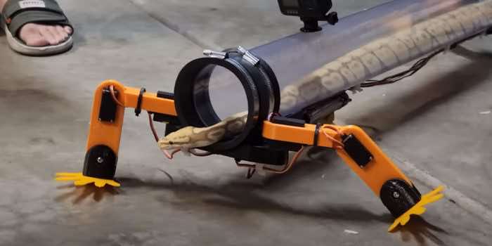 最初的尝试导致太多的蛇下垂。之后,潘确定了一个外骨骼的2.0版本,有四条腿——两条在前面,两条在后,就像西方的三趾石龙子,一种有四条很小的腿的蜥蜴。它由一个长长的管子组成,蛇可以很方便地进出。不幸的是,蛇还不能决定机器人走到哪里,尽管Hackaday推测了如何实现这一目标。