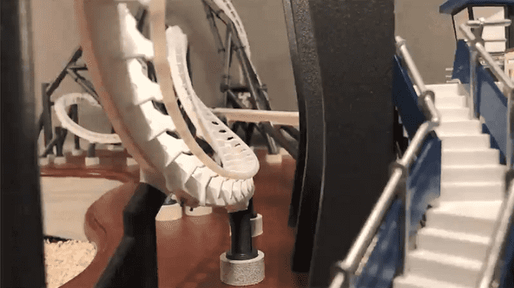 的微型版本self-launching过山车是由丹Fritsche打印整个模型的度过一个3 d打印机。整个项目与3000年花了大约900个小时来完成独立的部分3 d印刷。通过解剖整个机制的一个真正的过山车,他能够得到整个系统的一个简单朴素的布局。